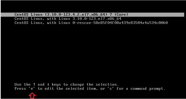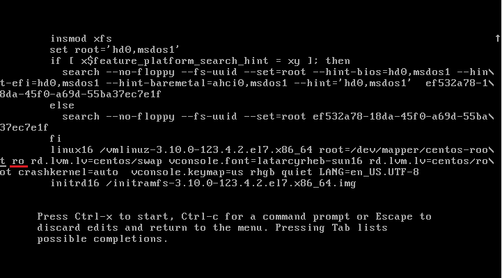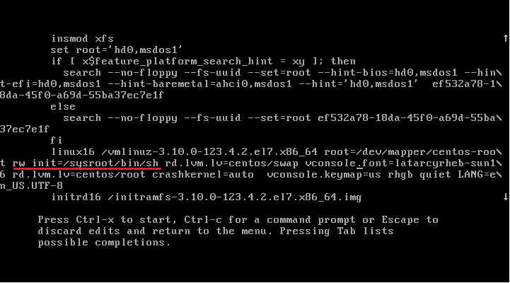 Затем надо прокрутить список и найти строчку linux16 /vmlinz-3.10.0-123.6.3.el7.x86_64 root=/dev/mapper/centos-root ro rd.lvm.lv=centos/swap ... в которой ro заменить на rw init=/sysroot/bin/sh