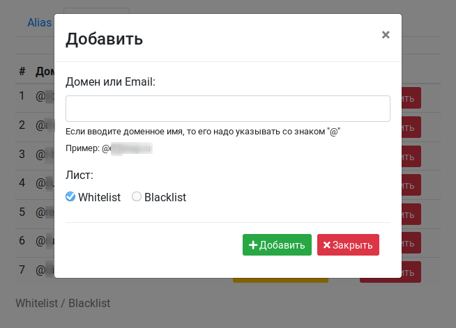 Белый список адресов электронной почты содержит одобренные вами адреса электронной почти или доменных имен, с которых можно отправлять письма в ваш домен.