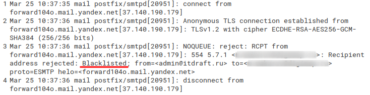 Лог сервера с отправителем из черного списка