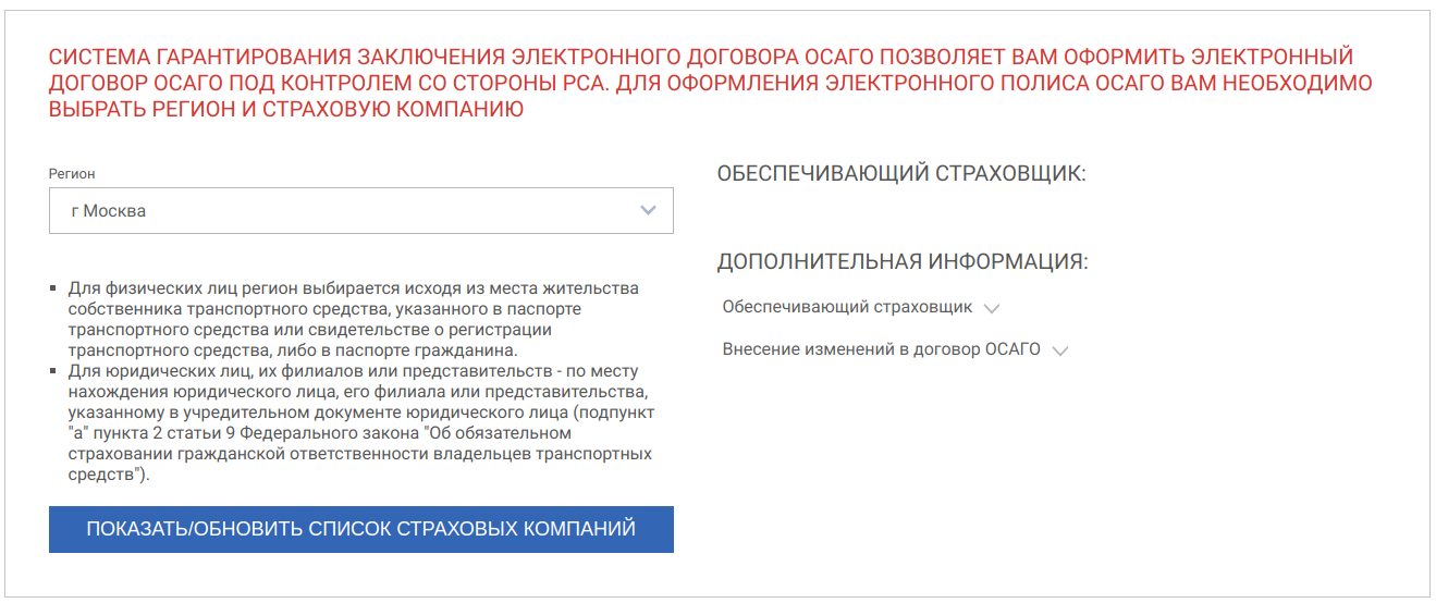На сайте РСА выбираем наш регион и жмем кнопку Показать/Обновить список страховых компаний