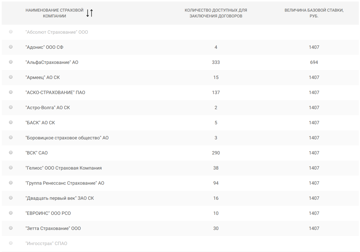 После чего отобразиться список страховых компаний. В левой части будет название компании, в правой величина базовый ставки.