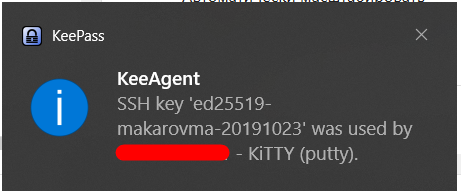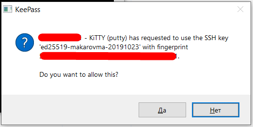 Так же появится запрос об использовании SSH-Ключа, а после подключения - уведомление от KeeAgent.