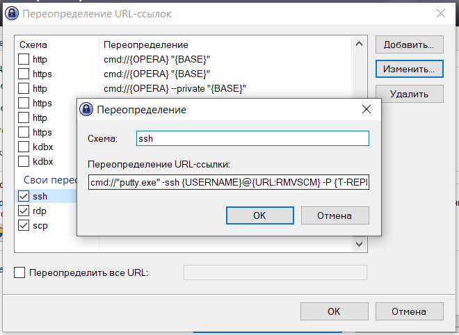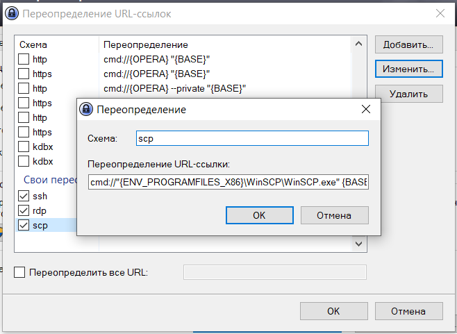 - Переопределение: cmd://"{ENV_PROGRAMFILES_X86}\WinSCP\WinSCP.exe" {BASE:SCM}://{USERNAME}:{PASSWORD}@{BASE:HOST}:{T-REPLACE-RX:/{BASE:PORT}/-1//}{BASE:PATH}