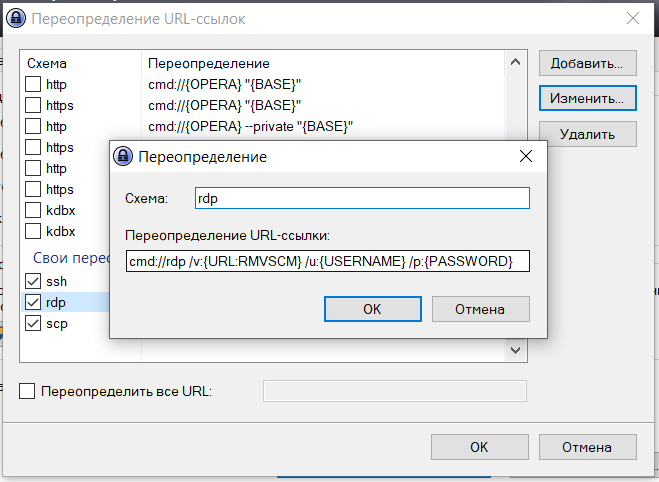 - Переопределение: cmd://rdp /v:{URL:RMVSCM} /u:{USERNAME} /p:{PASSWORD}