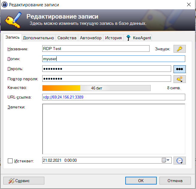 Применяем изменения, переходим в KeePass и добавляем новую запись или изменяем ранее добавленную.