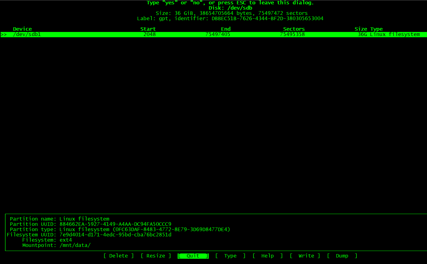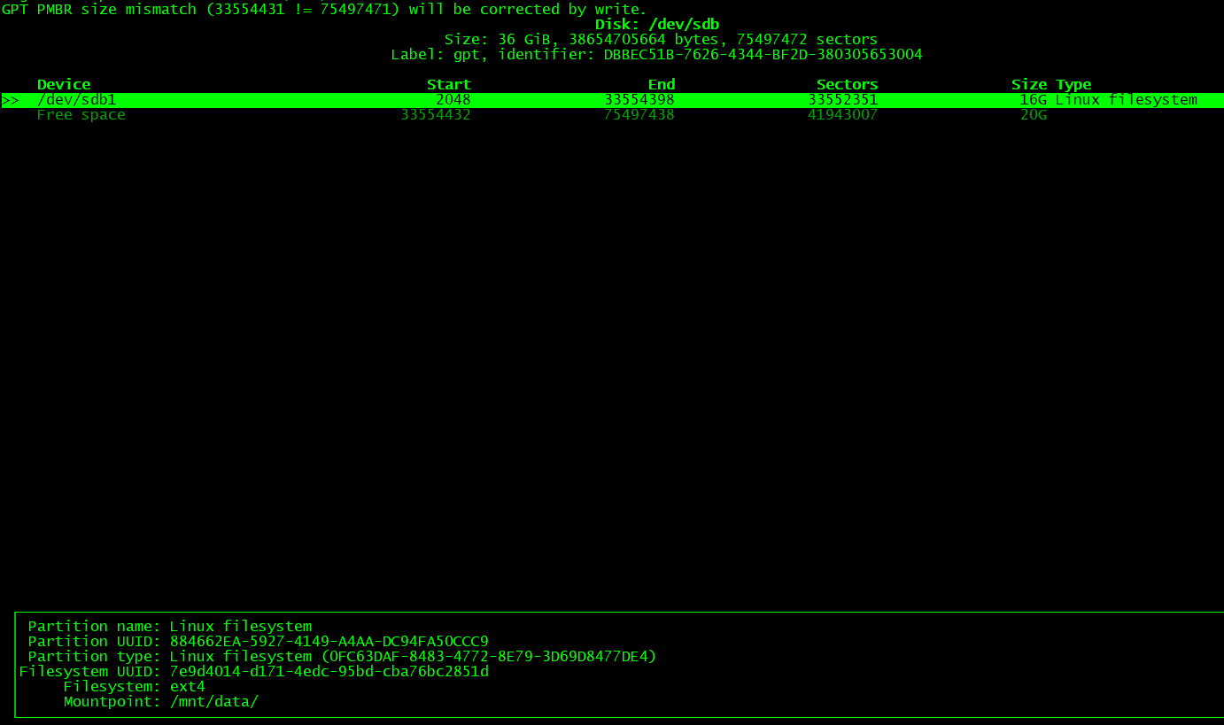 └─sdb1 8:17 0 36G 0 part /mnt/data