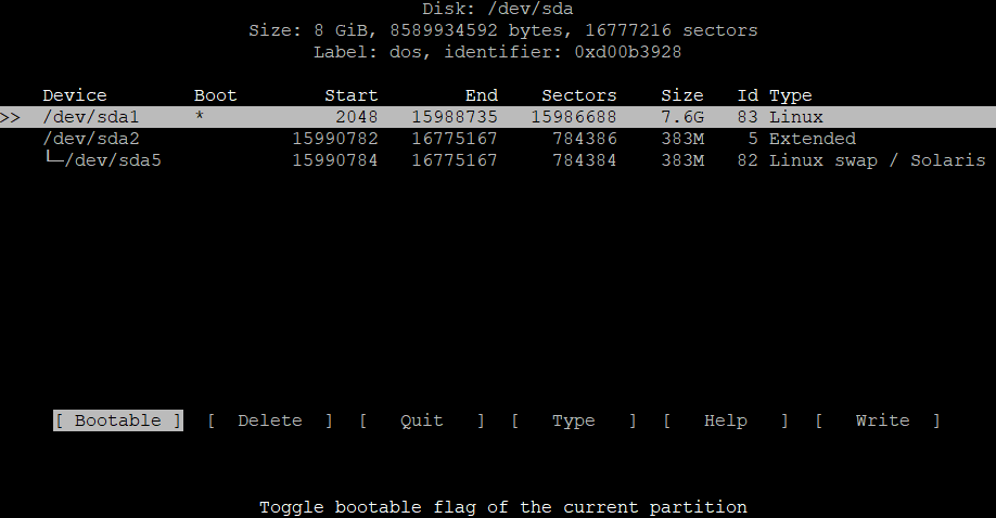 /dev/sda1 * 2048 15988735 15986688 7.6G 83 Linux