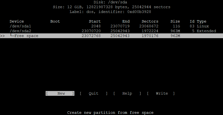 Disk /dev/sda: 12 GiB, 12821987328 bytes, 25042944 sectors