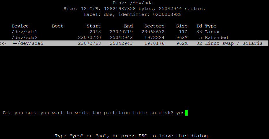 Таким образом мы удалили разделы на диске. Данный способ используется т.к. при автоматической разбивке диска в Debian (без LVM) корневой раздел оказывается в начале диска, а добавляемое пространство оказывается в конце диска. А между ними область, выделенная под swap.