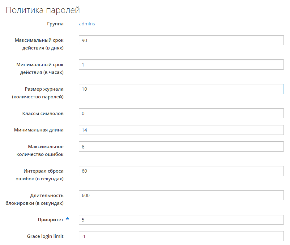 Но не забываем создать новую политику для FreeIPA админов: admins (добавив в эту группу админов FreeIPA), с Приоритетом = 5, и параметром Grace login limit = -1, что бы не потерять доступ к админке администратором FreeIPA, и не сбрасывать пароль пользователя admin