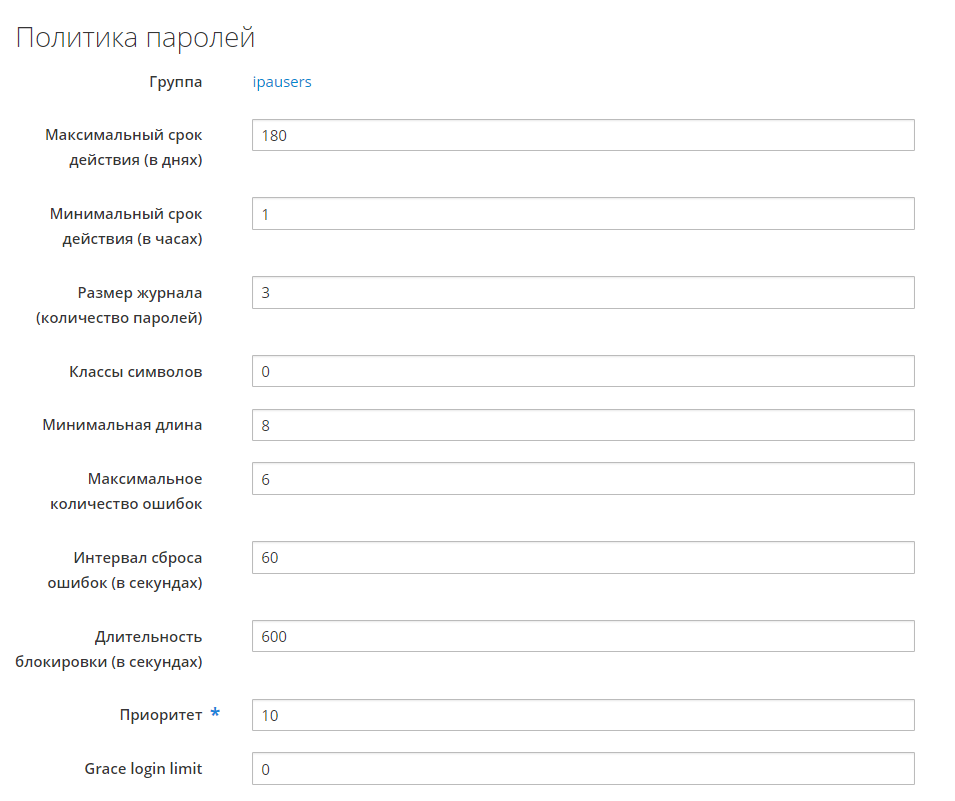 Но не забываем создать новую политику для FreeIPA админов: admins (добавив в эту группу админов FreeIPA), с Приоритетом = 5, и параметром Grace login limit = -1, что бы не потерять доступ к админке администратором FreeIPA, и не сбрасывать пароль пользователя admin