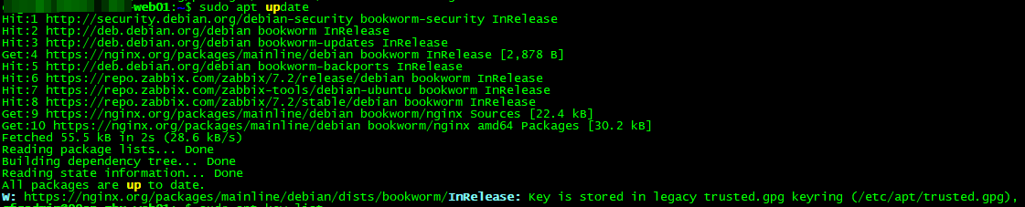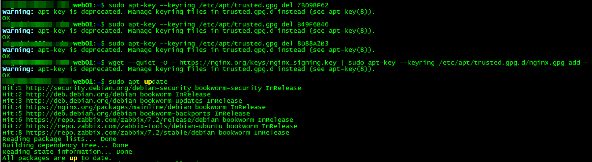 W: https://nginx.org/packages/mainline/debian/dists/bookworm/InRelease: Key is stored in legacy trusted.gpg keyring (/etc/apt/trusted.gpg), see the DEPRECATION section in apt-key(8) for details.