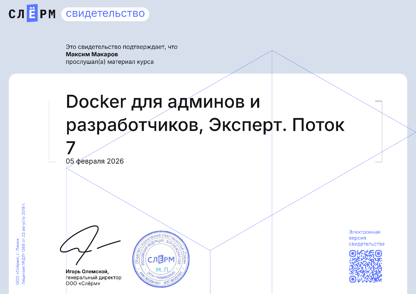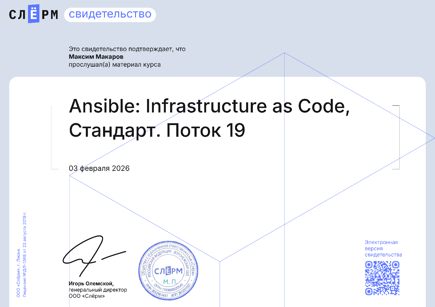 Помимо изучения программного обеспечения, технологий и ведения документации, я периодически прохожу курсы повышения квалификации. Ниже представлен список курсов, который я успешно прошел, и применяю навыки в рабочем процессе. Этот список так же периодически пополняется.